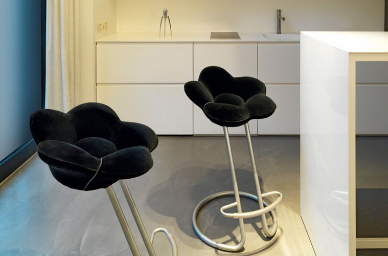 Anche questo sgabello ha la forma di un fiore. Lo stelo inclinato è il sostegno portante della seduta.