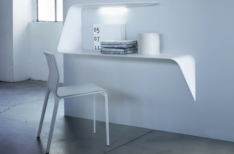 – La mensola scrivania Mamba con la sua forma sinuosa a nastro continuo sembra apparire dalla parete e sparire allo stesso tempo . E’ un complemento d’arredo a metà tra una scrivania e una mensola. E’ realizzata in Cristalplant®.