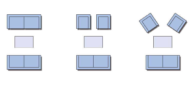 La disposizione classica è quella frontale con divani e poltrone disposti frontalmente in modo da poter creare al meglio una zona di conversazione. In mezzo è possibile inserire un tavolino basso, facilmente raggiungibile da ogni posto.