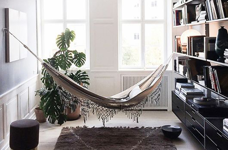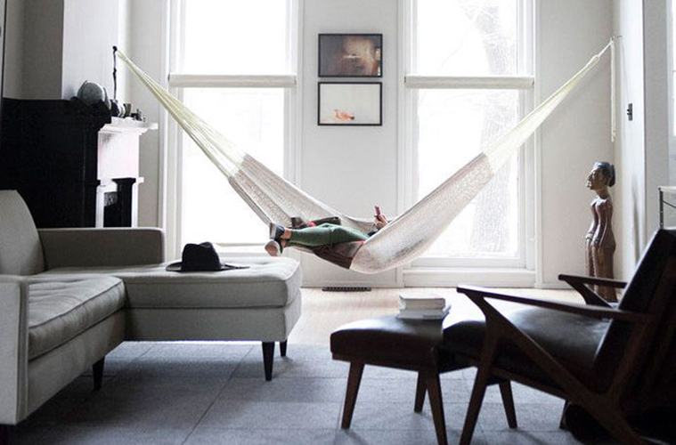 Perché non sta scritto da nessuna parte che l’amaca è un arredo solo da giardino. I fortunati che hanno una casa spaziosa possono permettersi questo tipo di relax….