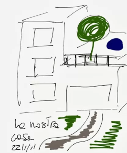 Contemporanea e minimalista. Per darvi un’idea, questo schizzo rappresenta la mia casa ideale. Per gli interni invece mi risulta difficile dare una definizione perché vario molto; mi piace cambiare spesso, ma due o tre punti fermi li ho anch’io: la semplicità come concetto/aspetto di fondo, la personalizzazione e il colore bianco.