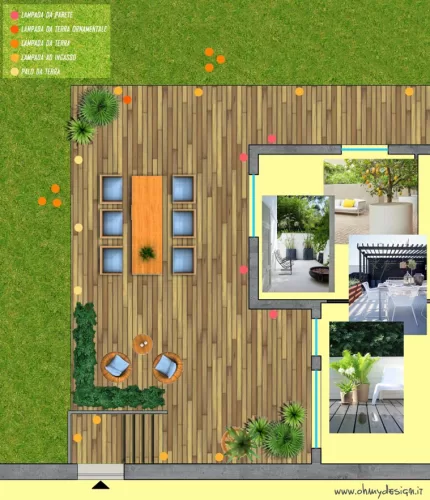 Ho diviso l’ambiente in due zone funzionali, un angolo conversazione ed una zona pranzo. La pavimentazione in legno è delimitata da lampade a led ad incasso, da una parte e da lampade a palo, dall’altra. La parte sistemata a prato ospita qua e là delle lampade a terra con la funzione di illuminare ma anche di decorare. Inoltre il tavolo è illuminato da una lampada di grandi dimensioni.