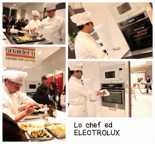 Il compito di preparare profumatissime pietanze era dello chef Giuseppe Pappalardo, impegnato tra il forno Vaporex (che associa al calore il vapore) e la piastra ad induzione (che riscalda solo il fondo della pentola riducendo i tempi di cottura), entrambi di Electrolux.