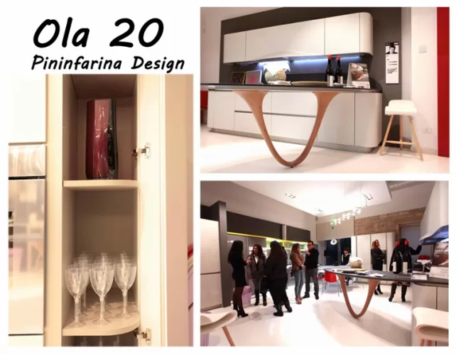 La Ola 20 riconoscibile non solo per la finitura delle ante micalizzate ma, soprattutto, per il suo disegno morbido, privo di spigoli e il segno curvo riproposto come base della penisola in legno stratificato e sagomato prodotto artigianalmente. Anche le parti finali dei mobili contenitori hanno la forma arrotondata, così come la cappa è nascosta dietro ad una bombatura sul pensile contenitore.