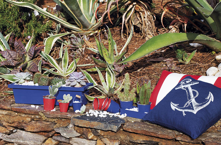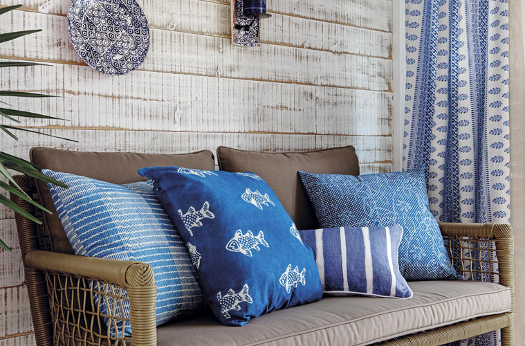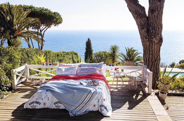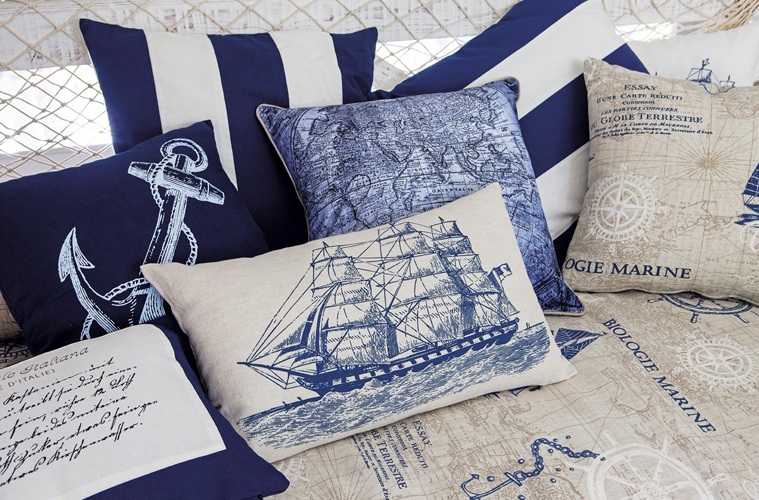 Le collezioni bagno e letto sono ispirate al mare con stampe di ancore, barche e pesci, con blu intensi, rossi e bianchi.