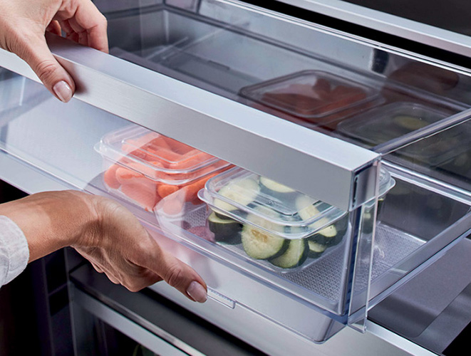 La cura nell’illuminazione è un plus da non sottovalutare. Il sistema True-View™ offre luce discreta e puntuale su ogni ripiano, in modo da non rivolgere la luce direttamente verso lo sguardo di chi apre il congelatore. Ogni ripiano ha una sua illuminazione e può essere regolato o rimosso a seconda delle esigenze. Anche i balconcini laterali e il contenitore snack sono riposizionabili e removibili per avere la massima flessibilità di utilizzo. I cassetti hanno inoltre una chiusura ben sigillata, per garantire un controllo nella conservazione ed evitare dispersione di umidità.