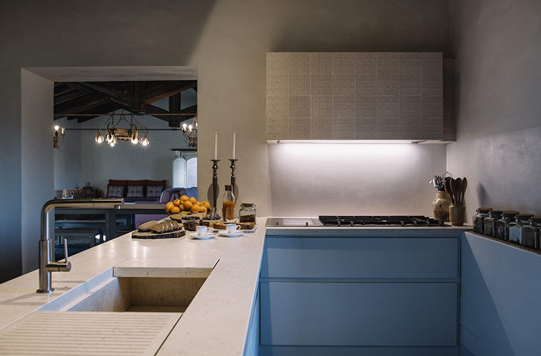 Lo stile contemporaneo della cucina, interamente bianca, fa da contrasto alle pareti in pietra lavica. Questa aperta ai visitatori ospita un unico grande tavolo, proprio come vuole la tradizione delle feste in Sicilia.