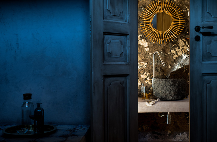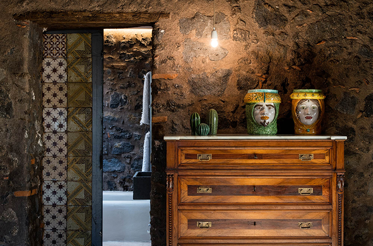 Le decorazioni rendono omaggio alla tradizione rurale della Sicilia cercando essenzialità e spontaneità: unendo la durezza della pietra lavica e del ferro battuto con la delicatezza dei decori sulla ceramica.