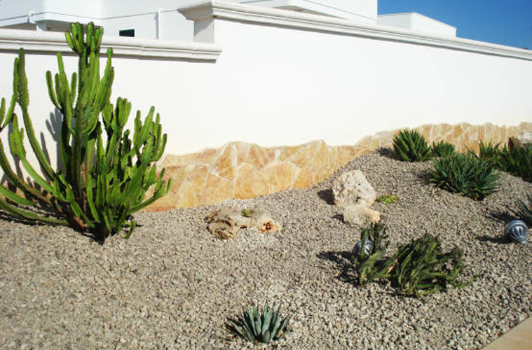 Questo spazio verde trova posto su una soleggiata terrazza. Qui varie tipologie di succulente, sono posizionate in aiuole riempite di piccoli sassi e delimitate da un cordolo di mattoni.